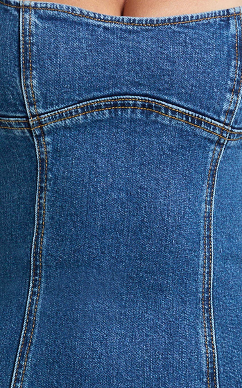 This wide neck, corset-detail maxi serves sculpted shape and effortless edge in a deep blue wash, snatched through the waist, sleek through the skirt, and made for big entrances. Think quiet luxury vibes with a hint of naked dressing thanks to that structured, curve-hugging bodice and clean lines that do the talking.