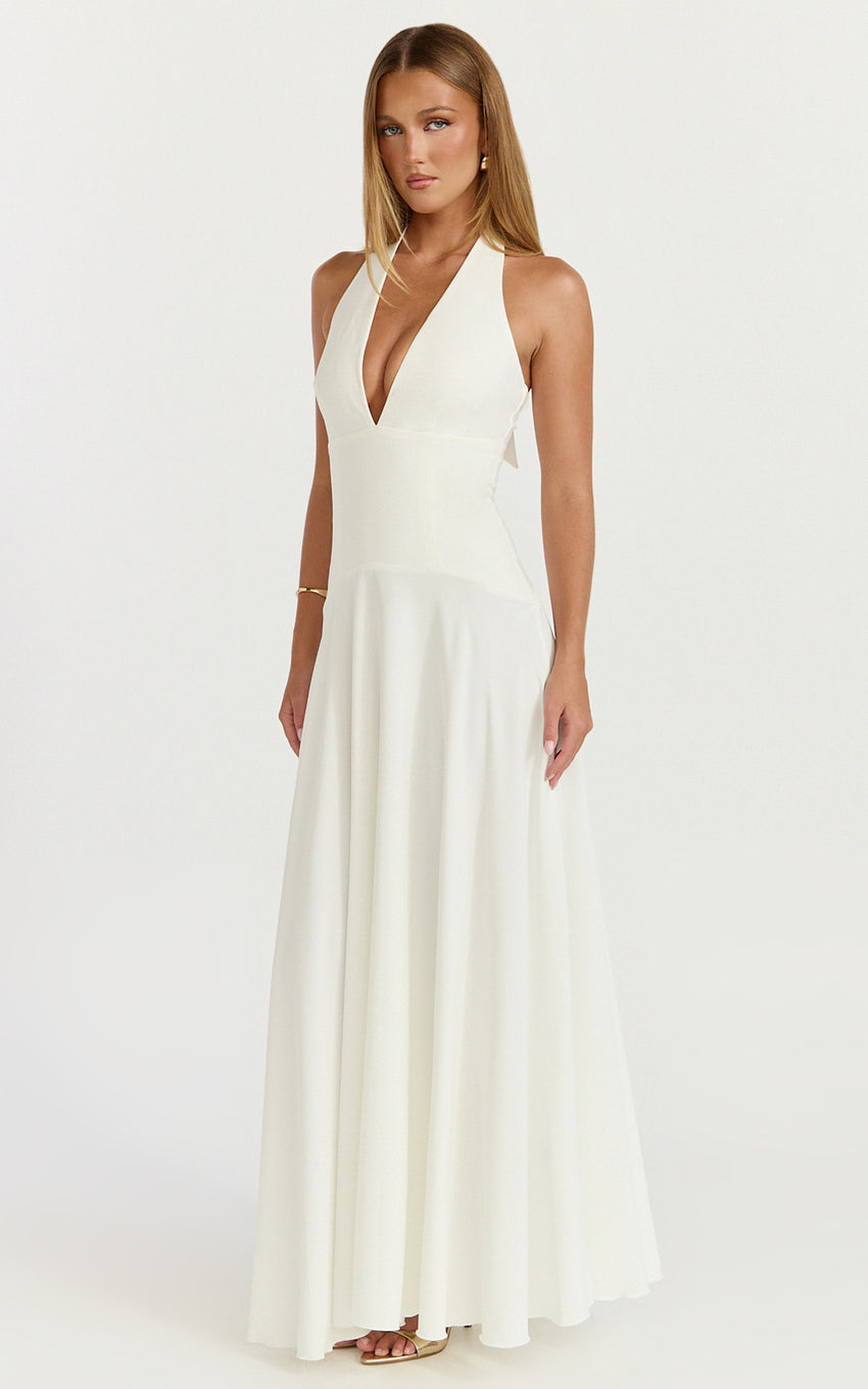 Poppy Maxi Dress - Contrast Skirt Deep Plunge Halter Dress In Off White makes confidence the main event. The halter neckline lifts and flatters, the plunge adds a little flirt, and the maxi length keeps it chic. Inclusive. Always. This is one of those Dresses that slips on and suddenly everything feels easy.